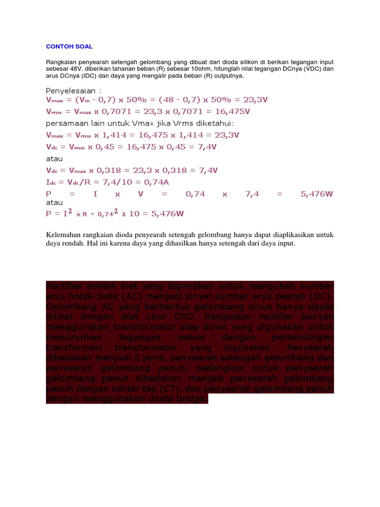 Contoh Soal Penyearah Setengah Gelombang / Penyearah Setengah Gelombang Dengan Satu Dioda Nulis Ilmu Com : Jika jarak antara puncak gelombang dengan dasar gelombang adalah 2 m, maka amplitudonya setengah dari jarak tersebut, yaitu 1 m.. Kalau di lihat dengan osiloskop, maka tegangan berbentuk seperti gelombang yang terpotong setengahnya, makanya dinamakan penyearahan setengah gelombang (half wave rectifying). Rangkaian penyearah gelombang penuh 1.rangkaian penyearah setengah gelombang merupakan rangkaian penyearah sederhana yang hanya dibangun menggunakan satu diode saja, seperti diilustrasikan pada gambar berikut. Diberikan tahanan beban (r) sebesar 10ohm, hitunglah nilai tegangan dcnya (vdc) dan arus dcnya (idc) dan daya yang mengalir pada beban (r) outputnya. Ada dua jenis penyearah gelombang penuh yaitu jenis penyearah dua dioda dan penyearah sistem jembatan. Rangkaian ini banyak digunakan pada power supply dengan.