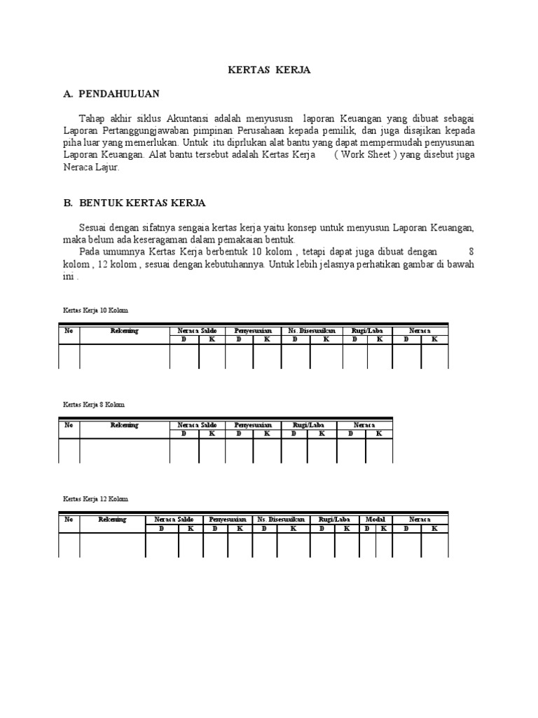 Check more flip ebooks related to kertas kerja pembelajaran abad ke 21 of norhidayah abuhussin. Kertas kerja akan dibuat karena dapat memperingkas suatu laporan keuangan melalui pada fungsinya. Pada periode yang berakhir 31 desember 2005, pd rhn memilki neraca saldo sebagai berikut: Ada 2 metode dalam penyusunan kertas kerja; Pemerintah mengeluarkan peraturan perpajakan baru pada tahun 2013.peraturan ini ditujukan kepada para pengusaha mikro kecil dan menengah (umkm).pemungutan pajak